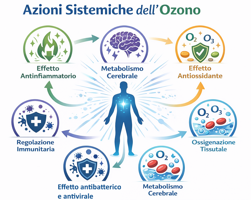L’ozono sistemico agisce come regolatore redox, modulatore dell’infiammazione, stimolatore delle difese antiossidanti, facilitatore dell’ossigenazione tissutale, sostenitore del metabolismo cerebrale (ambito di studio).