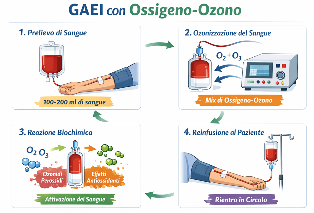 La GAEI (Grande Auto Emo Infusione) è una procedura in cui una quantità di sangue del paziente viene prelevata, trattata con una miscela di ossigeno e ozono, e poi reinfusa nella stessa persona. È chiamata anche autoemoterapia maggiore o grande autoemotrasfusione ozonizzata e rappresenta una delle tecniche principali dell’ossigeno-ozonoterapia sistemica.